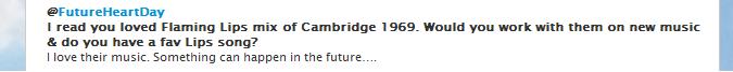 - Last year I asked Yoko (via twitter) if she would work again with The Flaming Lips – who appear on her 2007 album Yes, I’m a Witch. She replied, “I love their music. Something can happen in the future….”
