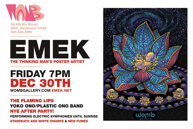 As explained by Womb organizer and co-owner Rick Sinnett  in the first minute of the above video, the psychedelic art gallery he runs with The Flaming Lips’ Wayne Coyne and Jake Harms had big plans for New Year’s weekend.  Acclaimed “thinking man’s” poster artist Emek was scheduled to kick-off the festivities Friday night with his final Poster + Retrospective & Book Signing of 2011.