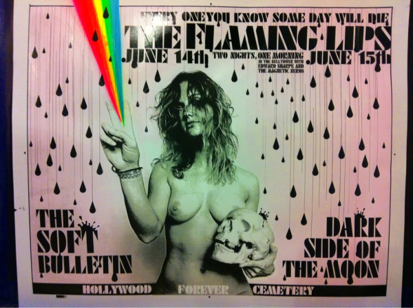 When Wayne Coyne tweeted a video of himself at The Alcove of Devotion inside Hollywood Forever Cemetery in February (watch it in the first 15 seconds of the above video) – noting he was “Gonna try and do a Flaming Lips show there” – the idea of The Flaming Lips actually playing in this graveyard almost seemed too weird to be true – even by Flaming Lips standards.  But alas, by early April he had a psychedelic poster circling the web – a topless woman holding a skull in one hand and shooting a rainbow out of the peace sign she made with her other (see it and Wayne’s tweets at the bottom of this post) – announcing not just “a Flaming Lips show there” but three of them… over “two nights, one morning”…