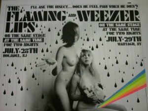 A July 11th presss release announced “LipsWeezer/ WeezerLips Extravaganzas”: “Weezer and the Flaming Lips will trade off songs back and forth for the entire length of each concert, allowing them to take turns playing a few songs each in one big exciting set… This will be a first for both bands as they will take the stage together and trade off songs. Naturally, these will be very special events and most likely will never happen again. The only thing that can be predicted is to expect the unpredictable. Yeasayer will provide support… Needless to say don’t miss these unprecedented, monumental happenings.”