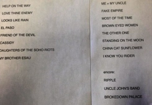 A teaser video snippet of Bob Dylan’s “Most of the Time” briefly appeared on YouTube earlier this week. That cover appeared in set 2 between “Fake Empire” and “Brown Eyed Women”>”That’s It For The Other One: The Faster We Go, The Rounder We Get.” Wait…there’s more highlights: “Standing on the Moon” and – best of all – a super jam “China”>”Rider” with organ and trumpet solos… and Sam ripping it up…