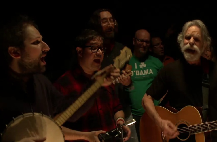 The one-off super group prepared for 16 hours in rehearsals (so says Yellowbirds’ Sam Cohen) under the direction of musical director/ Yellowbird Josh Kaufman. The Disco Biscuits’ Marc Brownstein MCed a panel that included independent presidential candidate Buddy Roemer, Mark McKinnon (former media advisor to George W. Bush, John McCain…and Bono!), climate change activist Jessy Tolkan and Dead lyricist John Perry Barlow. Questions for Weir were fielded from fans via Twitter during the panel discussions (tweet @yahoo_music with hashtag #BridgeSession).