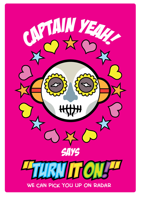 “Captain Yeah! has been around for about a year or so in different forms. He first came to light as a piece inspired by ‘I’m Working At NASA On Acid’ which features a psychedelic skull/astronaut. Originally I was influenced by Aztec skull fetishes. From there he developed in different directions for a number of pieces. Sometimes human [as in ‘All We Have Is Now’, left] and sometimes skeleton [like in The ‘Some Kind Of Love’ work, bottom]. I like the fact that he has different avatars and can be flexible visually.