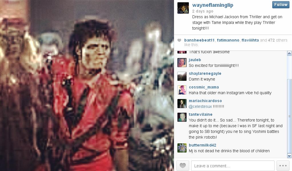 As much as a spectacle as the Lips were many there agree Tame Impala’s preceding set was even more so. Before the show Wayne Coyne teased on instagram, “Dress as Michael Jackson from Thriller and get on stage with Tame Impala while they play Thriller tonight!!!”