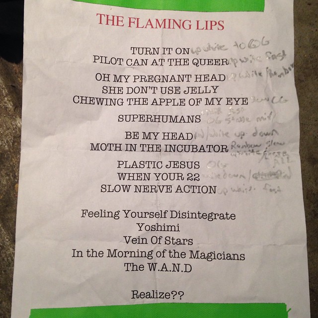 As if that weren’t remarkable enough, the opening act was none other than Steven Drozd and Wayne Coyne’s other band, The Electric Würms – their first ever show – playing their own material plus three Flaming Lips songs that have never been played live: “Found a Star on the Ground” (aka “The 6 Hour Song”), The Soft Bulletin companion’s “The Switch That Turns Off The Universe” and Embryonic’s “Your Bats.” Although a few songs had to be cut for time from the “hits set” (“The WAND,” “In The Morning of the Magicians” and “Do You Realize”), the triple set selection of songs are like no other Lips concert, and they brilliantly pulled it all off by all accounts.
