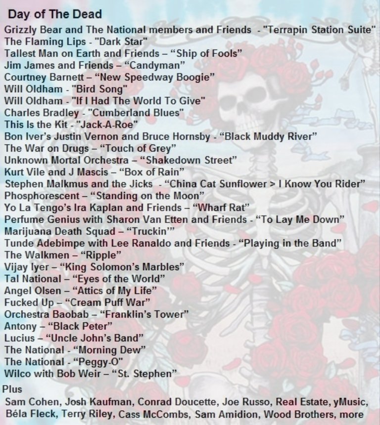 The Dessner brothers have since announced a one-off all-star tribute performance called ‘Day of the Dead’ at this year’s Eaux Claires festival. Based on that, Day of the Dead – singular – is seems to be the title they settled on. Artists confirmed in the interviews cited above, on social media by those involved with the sessions or by Rolling Stone’s Will Hermes (in a series of tweets on February 9, 2016 that have since been deleted) are listed below: