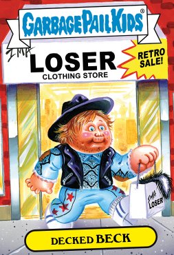 Topps trading cards is commemorating this summer’s music fest season with a set of American As Applie Pie stickers: ten acts you might have seen headlining a festival this year as Garbage Pail Kids. Each of these artists inspired two stickers: Beck (“Decked Beck” and “Hammy Hansen”), Dead and Company (“Bob Weird” and “John Slayer”), Radiohead (“Radio Dead” and “Tortured Thom”), The Roots (“Tree Roots” and “Quest Shrub”), Morrissey (“Meaty Morrissey” and “Sacrilege Smith”), Arcade Fire (“Arcade Fired” and “Lose Butler”), Red Hot Chili Peppers (“Fiery Flea” and “Affably Anthony”), Death Cab for Cutie (“Death Cab For Frontman” and “Bashed Ben”), Guns N’ Roses (“Overworked Axl” and “Gunnin’ For Rose”) and The Cure (“Crying Cure” and “Sobbing Smith”). Click on any of the links in the last sentence to purchase that sticker pair, or click here for the complete set.