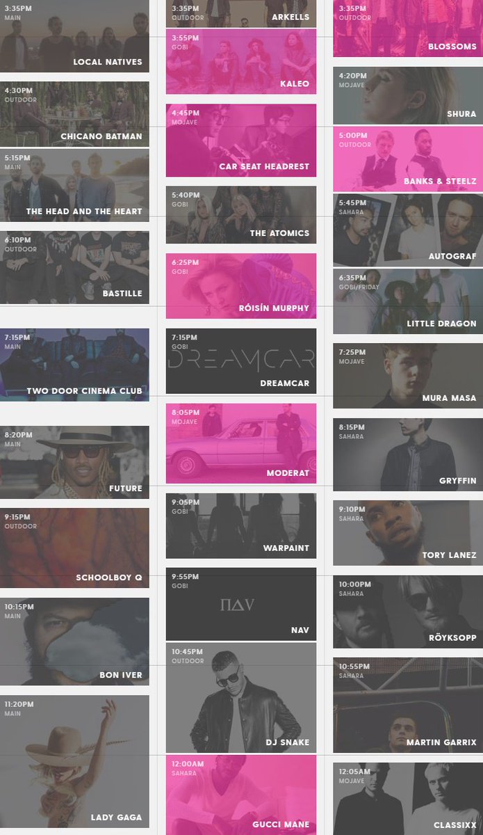 Lady Gaga, Bon Iver, Local Natives, The Head and the Heart, Warpaint, Gucci Mane, Car Seat Headrest, Two Door Cinema, Bastille, ScHoolboyQ, Future, Little Dragon, Tycho, Chicano Batman and more: