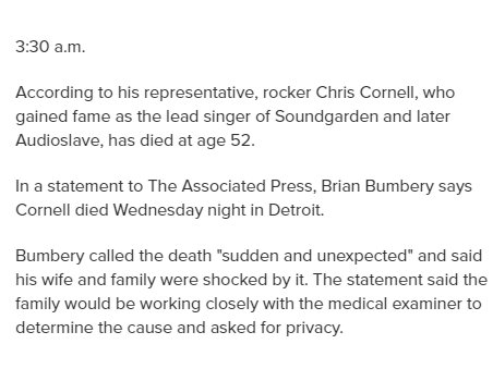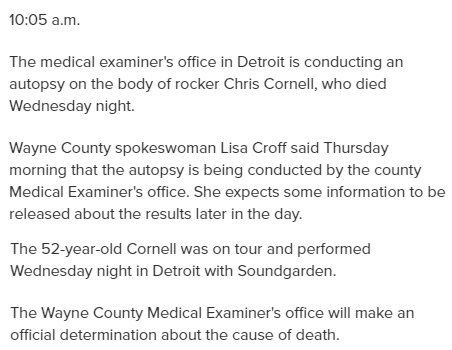 “Chris’s death is a loss that escapes words and has created an emptiness in my heart that will never be filled. As everyone who knew him commented, Chris was a devoted father and husband. He was my best friend. His world revolved around his family first and of course, his music, second. He flew home for Mother’s Day to spend time with our family. He flew out mid-day Wednesday, the day of the show, after spending time with the children. When we spoke before the show, we discussed plans for a vacation over Memorial Day and other things we wanted to do. When we spoke after the show, I noticed he was slurring his words; he was different. When he told me he may have taken an extra Ativan or two, I contacted security and asked that they check on him. What happened is inexplicable and I am hopeful that further medical reports will provide additional details. I know that he loved our children and he would not hurt them by intentionally taking his own life.