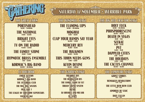 Harvest – A Civilised Gathering aims to be not just Australia’s newest music festival but “a new dimension in music & arts.” The six-stage event will take place over three single-day concerts in Melbourne (Werribee Park, Sat 12 Nov), Sydney (Parramatta Park, Sun 13 Nov) and Brisbane (Botanical Gardens, Sat 19 Nov). With Portishead headlining the main (“Great Lawn”) stage, the line-up also boasts The National, Bright Eyes, TV On The Radio, Holy Fuck, Phosphorescent and many more. The Flaming Lips-headlined Windmill Stage is not to be missed: Mercury Rev, The Walkmen, Clap Your Hands Say Yeah, Mogwai and others (see below- note, all three days have the same line-up).