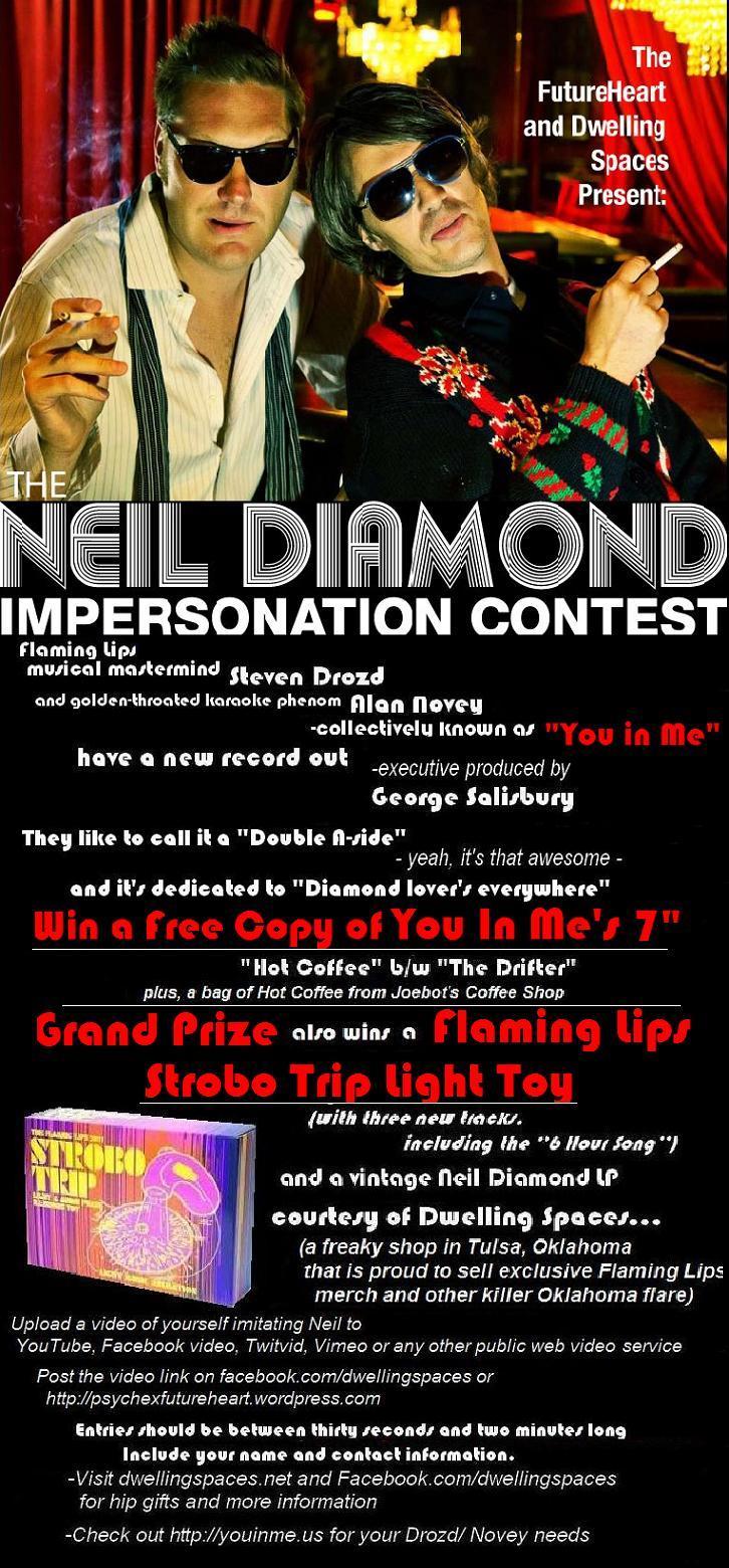 This 7″ single can also be won from The Future Heart Dwelling Spaces’ Neil Diamond Video Impersonation Contest – along with a Flaming Lips Strobo Toy, a bag of coffee (pun intended), and a vintage Diamond LP. The entire grand prize package is estimated at nearly $100. These generous prizes come from Dwelling Spaces – “like” Dwelling Spaces on facebook.